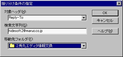実際の手順としては、「新規」ボタンを押して振り分け条件の設定ダイアログを開きます。 「対象ヘッダ」の部分を Reply-To: にして「検索文字列」に「フォーラム名.会議室番号@maruo.co.jp」と入力して、 「移動先フォルダ」で移動先フォルダを選択して[OK]ボタンを押して一覧に追加します。