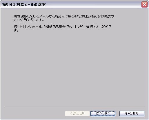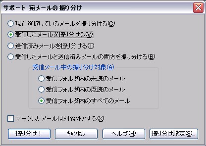 簡単振り分け設定ウィザードの最後で「今すぐ振り分ける」選択すると振り分け処理ダイアログが表示 されますので、「振り分け!」ボタンを押せば受信フォルダにあるメールのうち振り分け条件に合致する メールをすべて振り分けてくれます。
