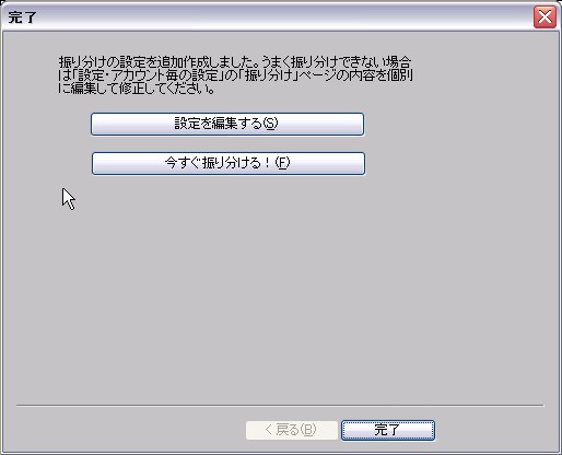 ここでは、今設定した振り分け設定をさらに細かく設定するか、振り分け処理を実行するかを選択 します。「今すぐ振り分ける」を選択すれば直ぐに振り分け処理を開始します。