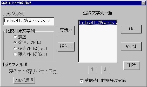 WeMail32 の場合は、振り分け情報の設定ダイアログの「受信時自動振り分け実施」チェックボックスにチェックが入って いれば、受信と同時に振り分け作業を行います。